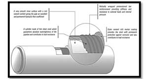 Manufacturing of BWSC pipe begins with fabricated steel cylinder with joint rings confirming to IS 15155:2002 which is hydraulically tested. A high rich cement mortar lining is placed at inner side of pipe by using centrifugally casting method. After the lining is cured, the steel cylinder is wrapped with MS bar, using slight tension in the bar. The size and spacing of the bar as well as thickness of the steel cylinder are proportioned to provide the required strength of the pipe. The steel cylinder and bar wrapping are covered with high rich cement mortar coating by using High Velocity impaction process.